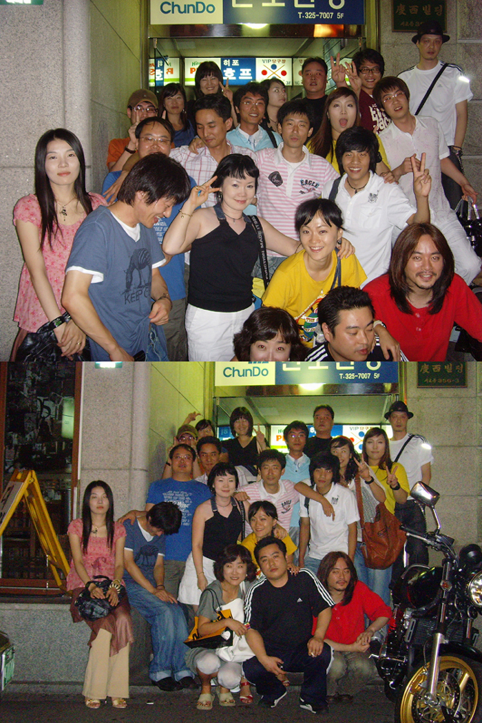 윗사진.. 지니형님.. 배경처럼 카메라를 향해 레이져 쏴주시고~ 쑤바 그옆에서 지니형님에게 레이져 쏴주시고~ 백호님 마치 합성처럼 조용히 서계시고~ 나는.. 기름때문에 이마 형태 잘보이고~ 저 뒷쪽은 어두웠는데 왜 내 이마만.. OTL..